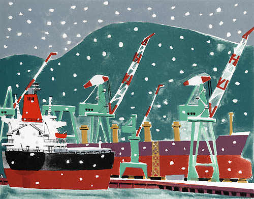 造船所暮雪 柳原 良平 1994年 リトグラフ 25×32cm YR001-G043 |